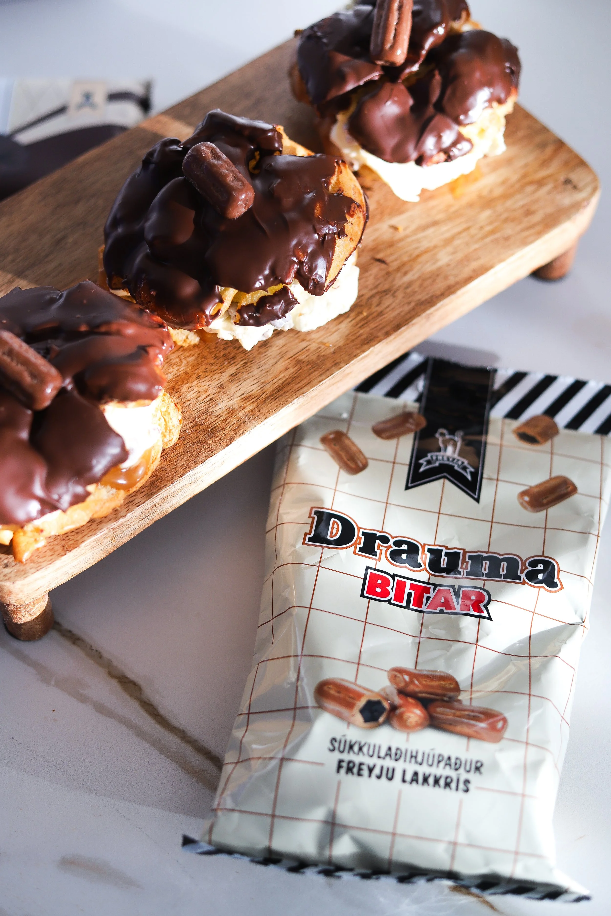 Skerið nú bollurnar til helminga, setjið karamellu í botninn. Fyllið bolluna með rjóma og setjið djúpur kurl yfir áður en þið lokið. Setjið brætt Freyju suðusúkkulaði ofan á lokið á bollunni og njótið!