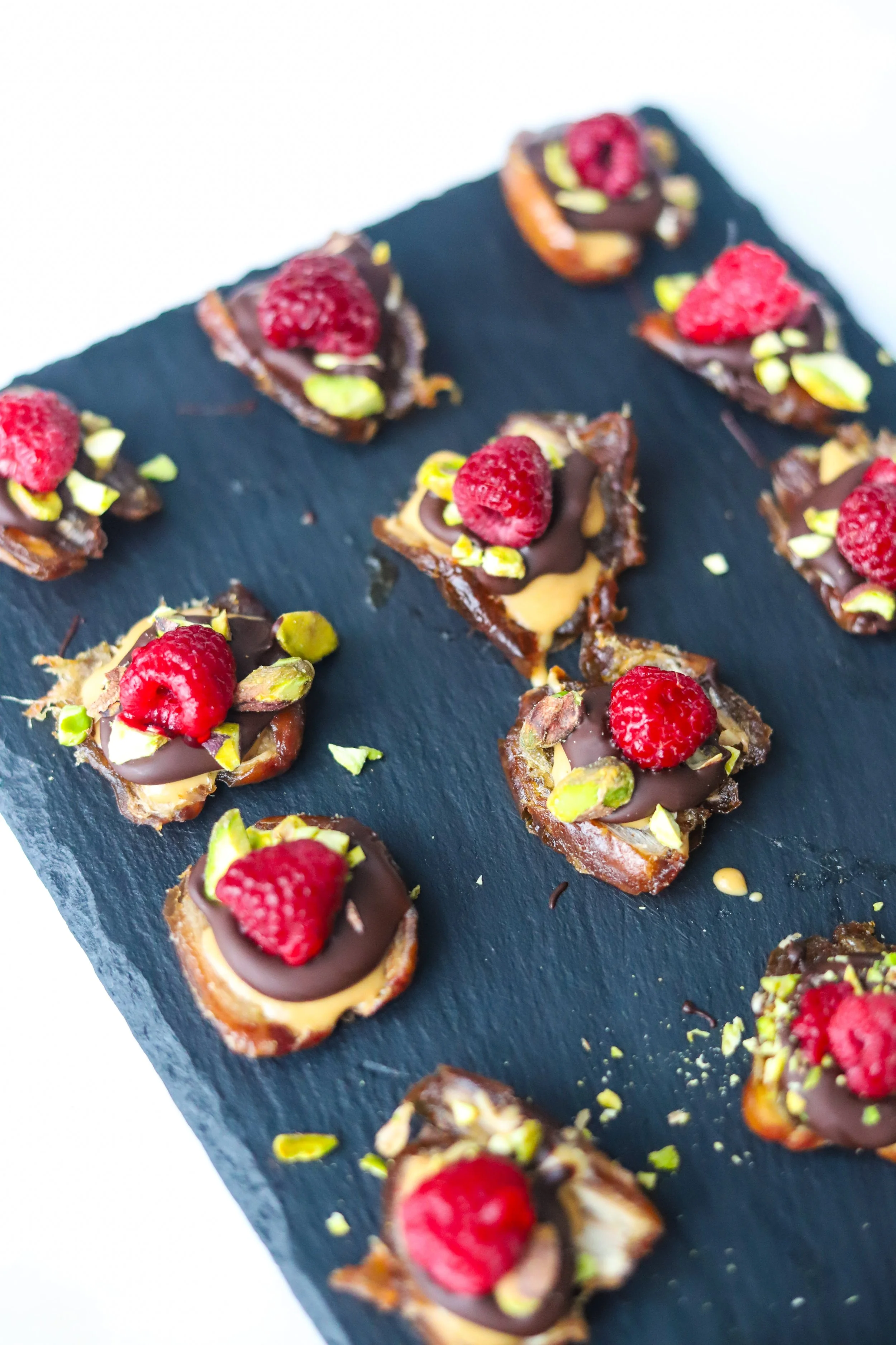 Setjið þar næst Freyju suðusúkkulaði og pistasíur á döðluna.