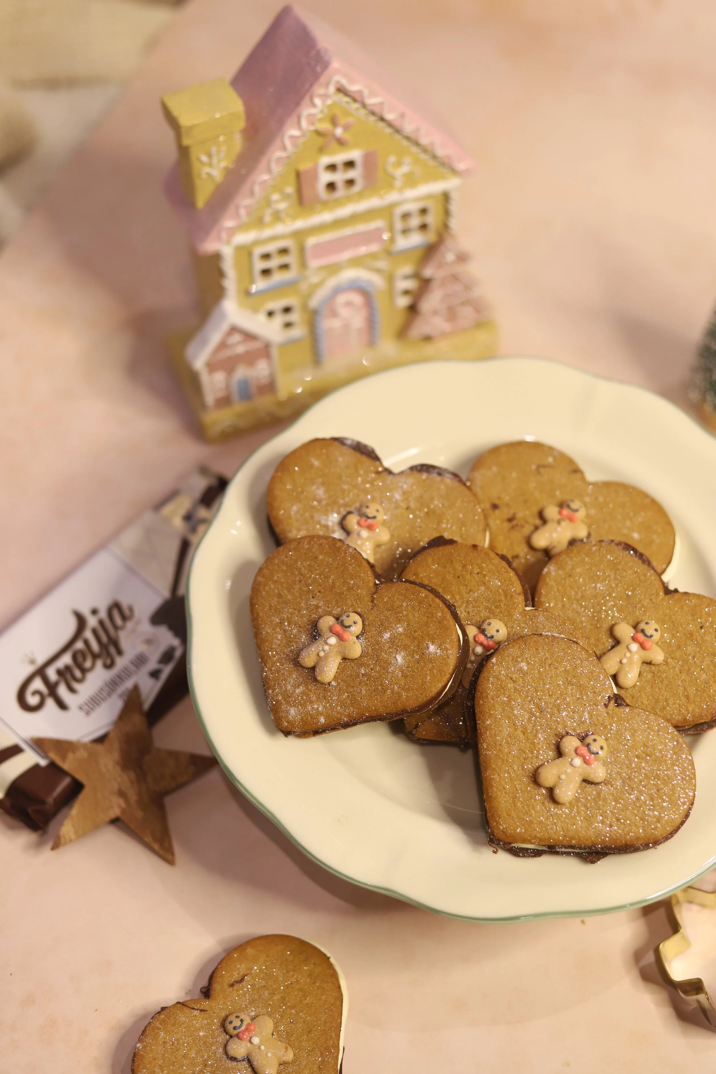 Takið tvær piparkökur og setjið krem á aðra piparkökuna. Leggið hina piparkökuna á smjörkremið og myndið eins konar samloku.